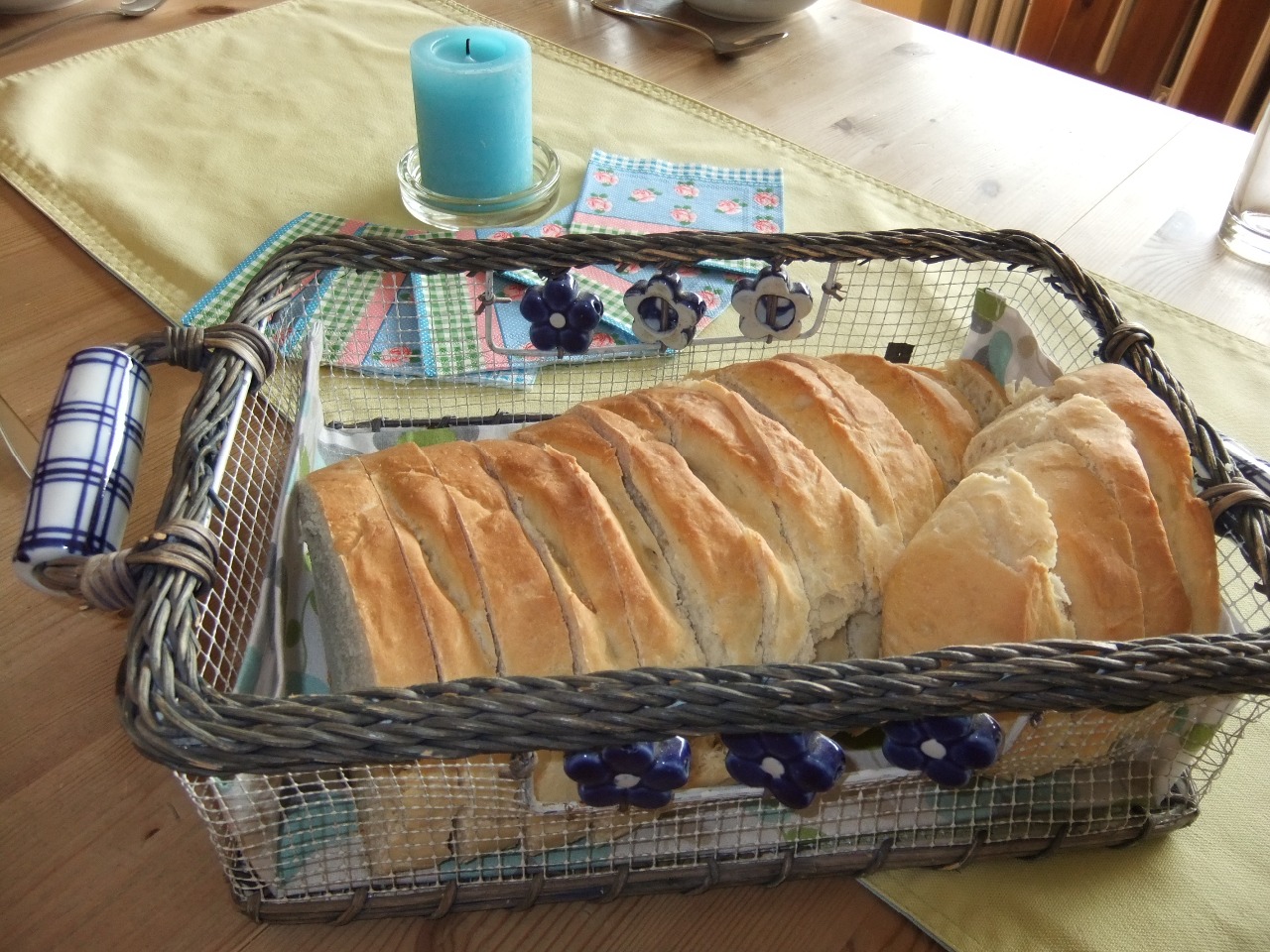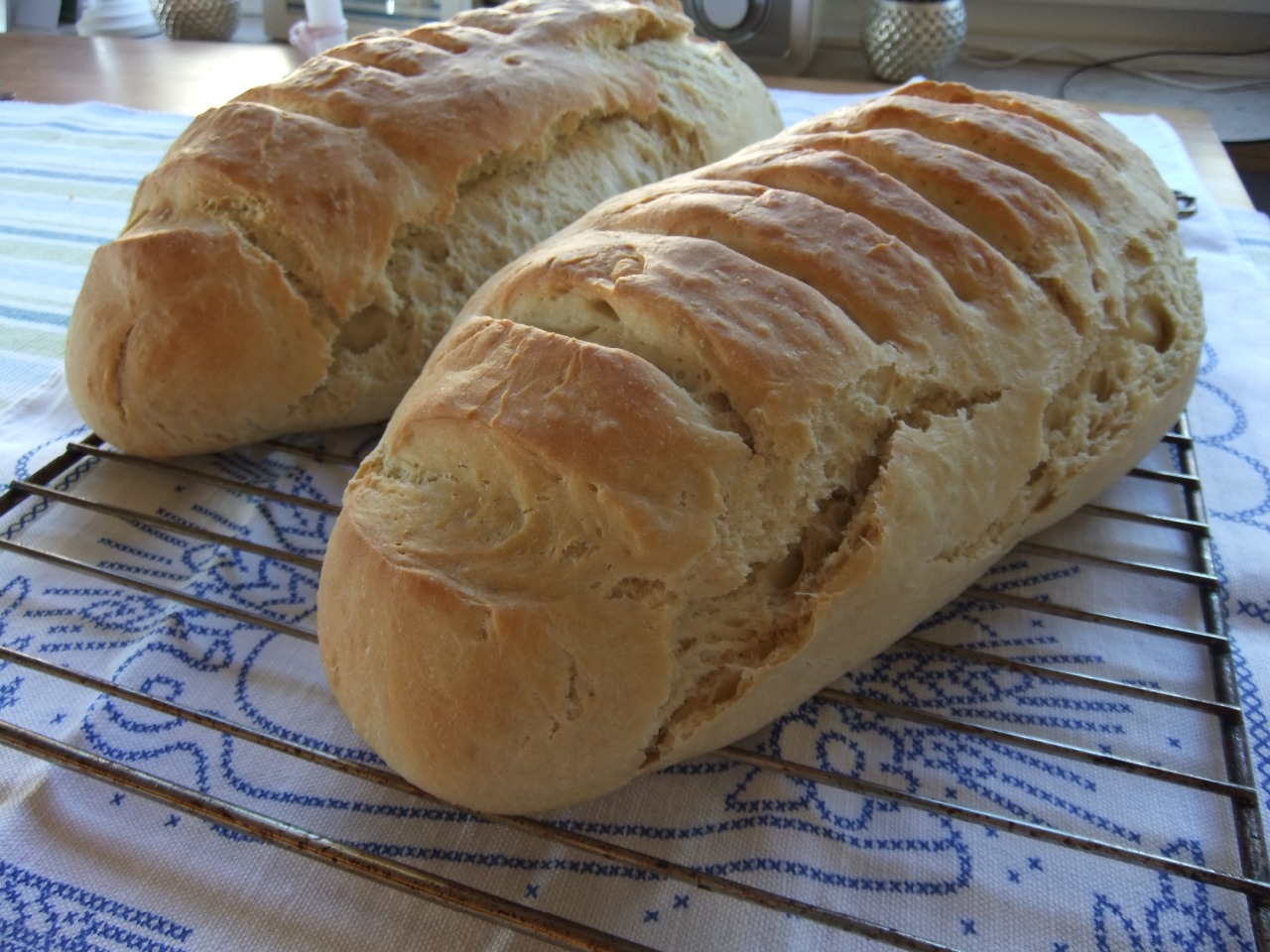 Aus 1300 g Mehl (Typ 550), es geht aber natürlich auch Mehl (Typ 405), 2 Päckchen Trockenbackhefe, 4 TL Zucker, 4 EL Pflanzenöl, 3 TL Salz und 700 ml lauwarmem Wasser wird ein Hefeteig geknetet. Diesen dann gehen lassen, bis er sich sichtbar vergrößert hat, danach noch einmal durchkneten, in 2 Hälften teilen und jeweils zu einem Brot formen, einschneiden und mit Wasser besprühen, noch einmal gehen lassen und dann bei ca. 180 Grad Ober-Unterhitze ungefähr 25-30 Minuten backen! Die Brote sind fertig, wenn sie sich beim Klopfen auf der Unterseite hohl anhören! Abkühlen lassen, anschneiden und genießen!