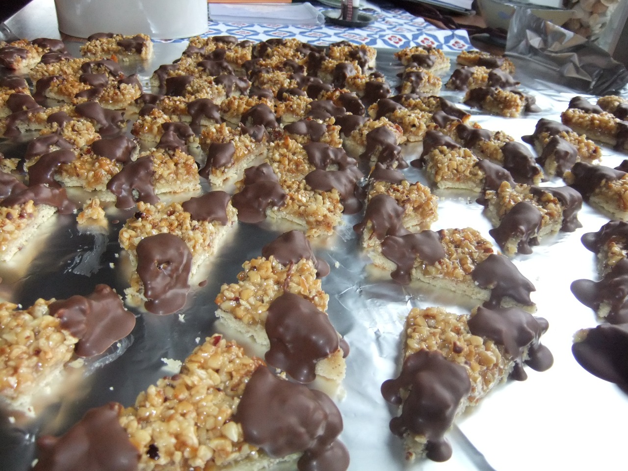 Noch heiß in Dreiecke schneiden und später die Ecken mit Kuvertüre überziehen.