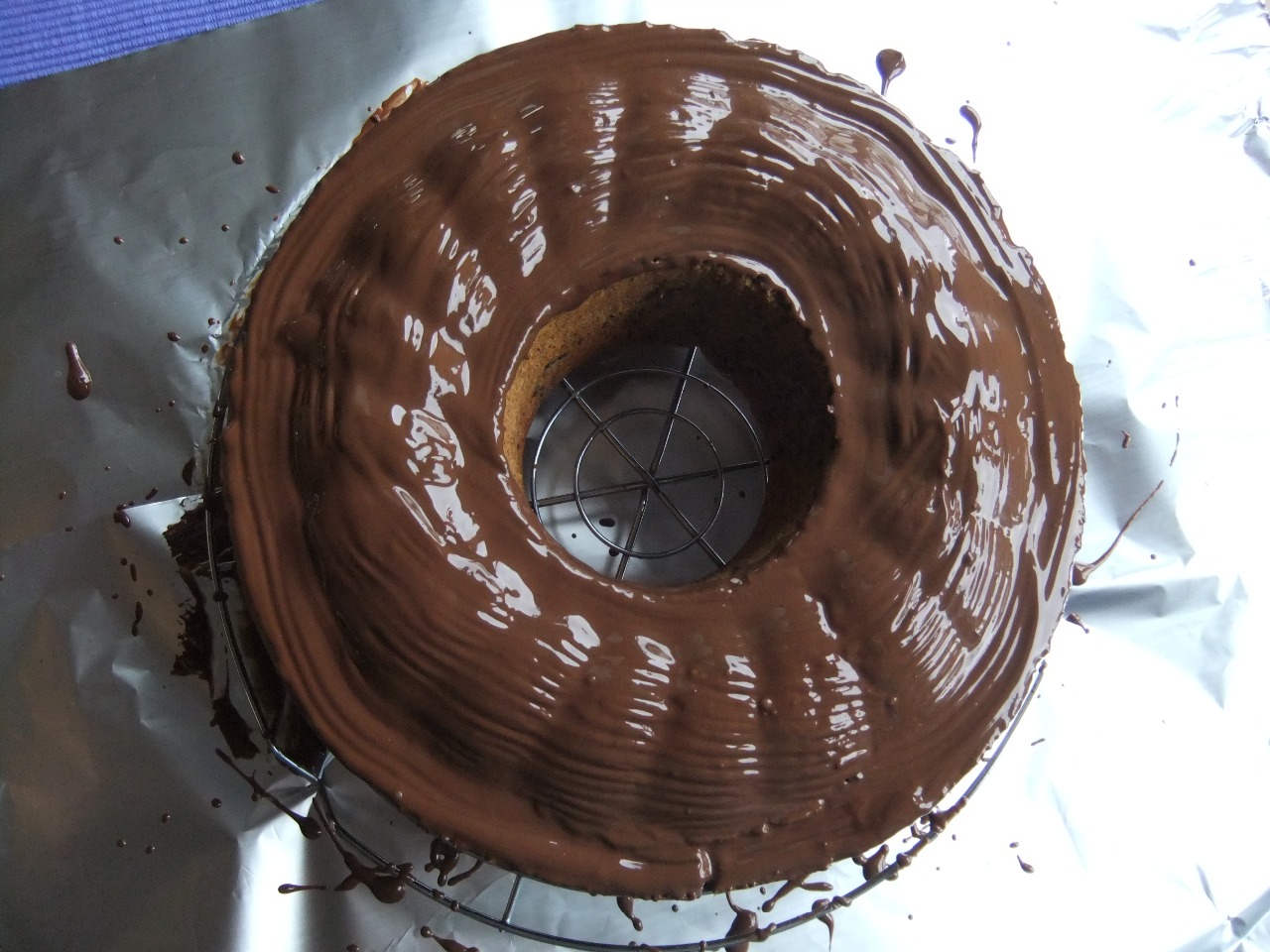 200 g Kuvertüre im Wasserbad schmelzen und den Kuchen damit bestreichen, gut trocknen lassen und genießen!