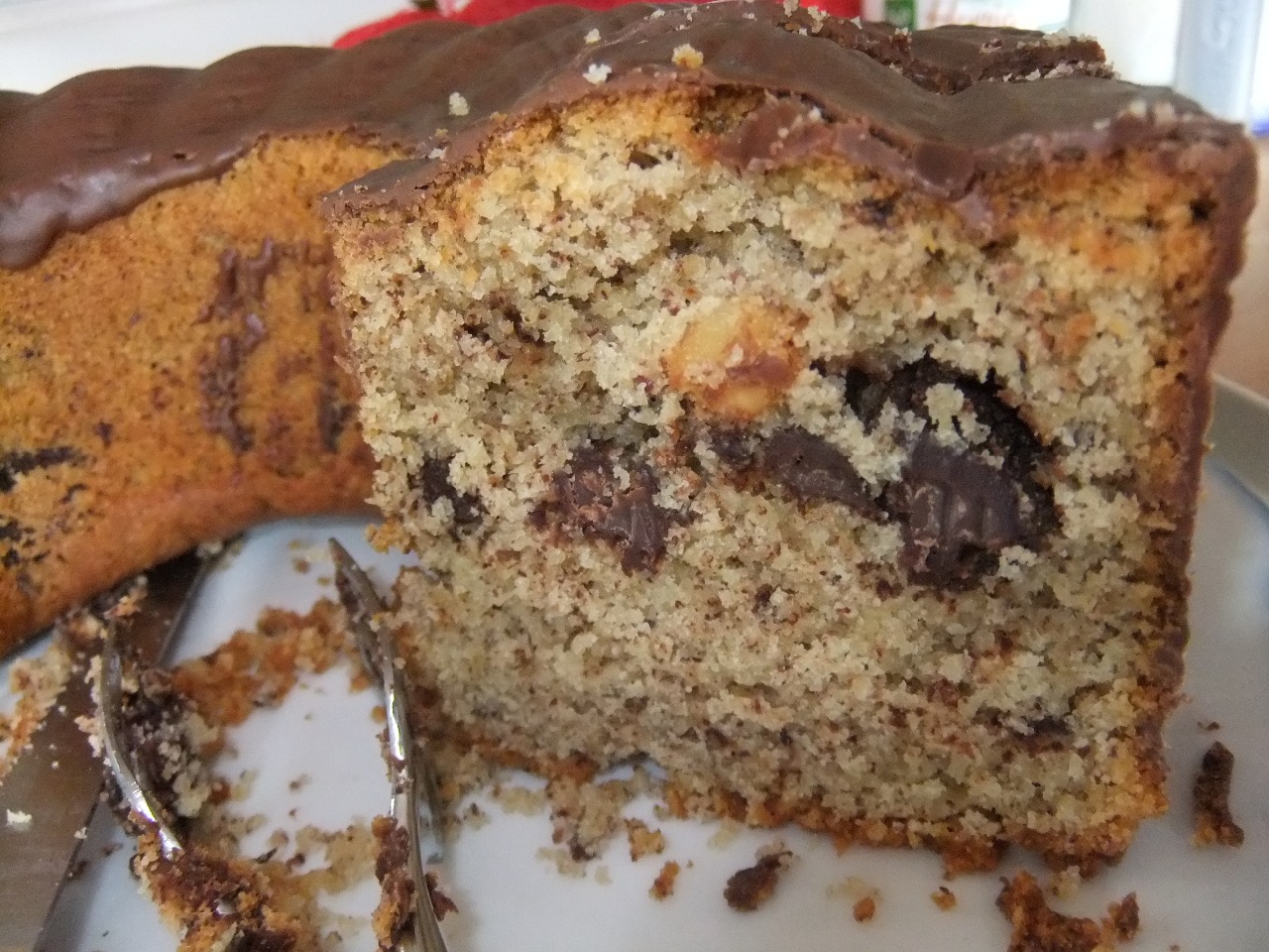 5 Eier, 250 g Butter, 300 g Zucker, ein Schuss Rum (den lasse ich weg), 250 g gemahlene Haselnüsse, 350 g Mehl, 1 Tasse Milch (oder mehr), 2 Päckchen Vanillezucker (oder 4 Teelöffel selbstgemachter Vanillezucker), 1 1/2 Päckchen Backpulver, 100 g Blockschokolade (mit dem Messer grob zerkleinert)