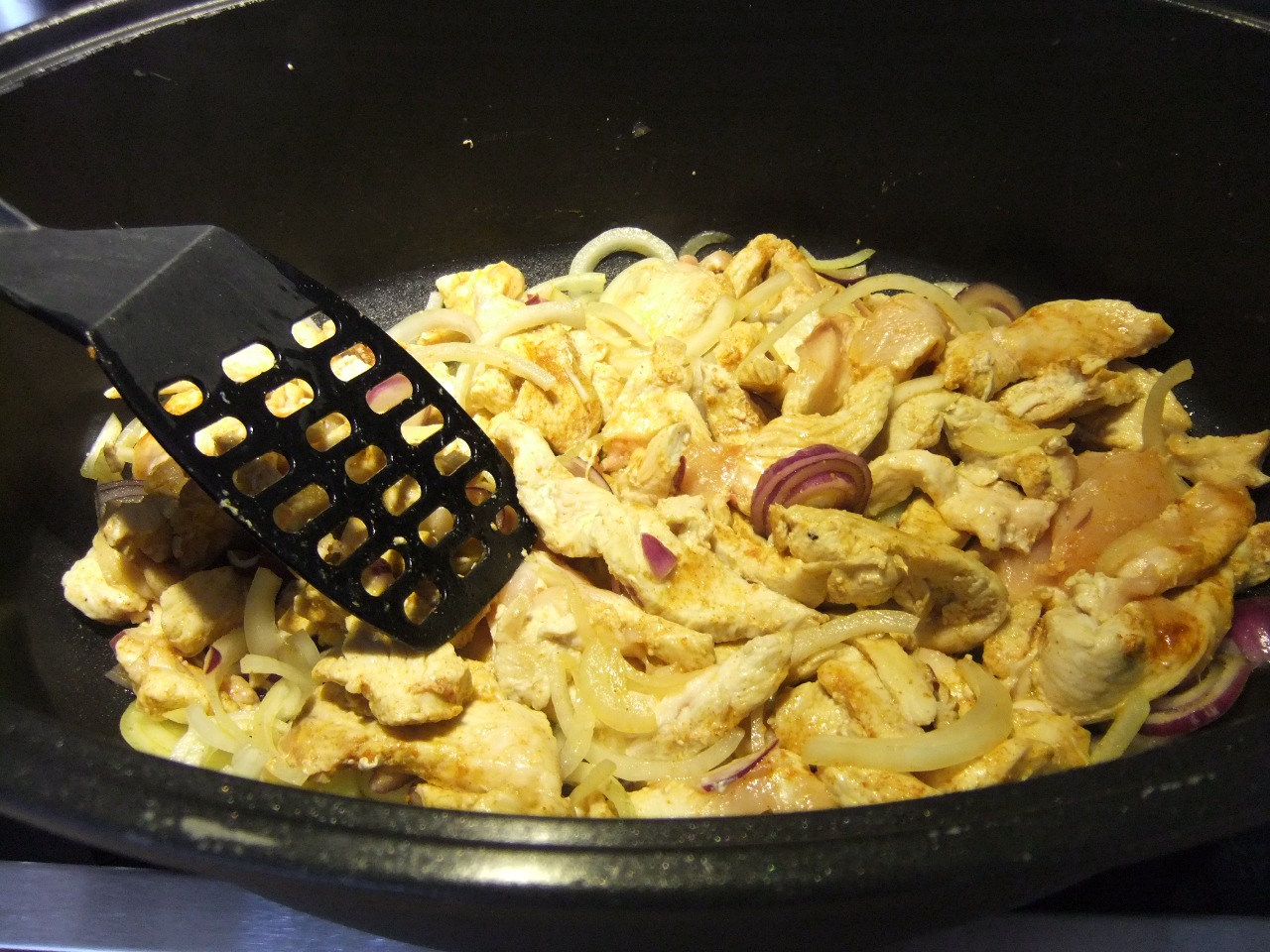 Das Öl wird erhitzt und das mit der Gewürzmischung bestreute Fleisch darin gut angebraten, dann gibt man die in Würfel oder halbe Scheiben geschnittenen Zwiebeln dazu und brät diese mit, nun mit etwas Mehl bestäuben, weiter anbraten und mit heißem Wasser/Hühnerbrühe ablöschen. Das Mehl bewirkt direkt die Bindung der Soße! Das Ganze jetzt eine Weile köcheln lassen (ca. 10 Minuten) und dann Curryketchup (Menge nach Geschmack, aber mind. ein guter Schuß) hinzufügen. Je nachdem, wieviel Soße man haben möchte, noch etwas Milch hinzufügen. Nun Sahne (ca. 100 ml) hinzufügen, mit 1 Teel Senf und den Gewürzen abschmecken. Wenn man es da hat, kann man auch mit Ingwer, Kurkuma, Koriander und Kreuzkümmel nachwürzen. Das wichtigste aber ist Curry (was ja an sich auch eine Gewürzmischung ist)! Man kann auch das Mehl weglassen und am Ende die Soße mit hellem Soßenbinder binden.