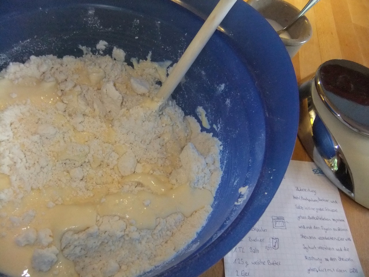 Eier und Joghurt verrühren und die Miscung zu den Streuseln geben. Kurz mit einem Löffel verrühren, bis gerade alles vermischt ist.