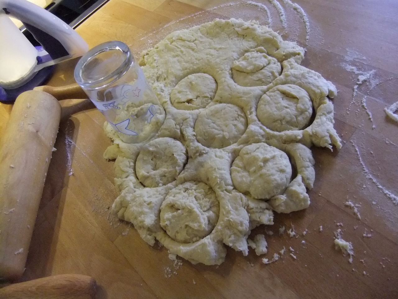 Den Teig etwa 4 cm dick ausrollen und mit einem Glas Kreise ausstechen.