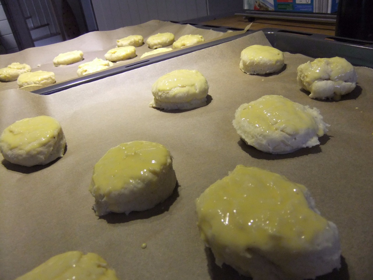 Diese auf ein Backblech legen, mit dem verquirlten Eigelb-Sahne-Gemisch bestreichen...