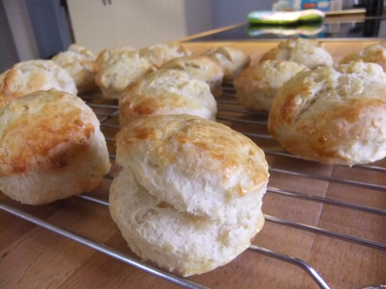 Es ist wirklich wichtig, dass der Teig nicht zu flach ausgerollt wird, damit die Scones schön hoch werden und an der von selbst entstehenden Kante auseinander geklappt werden können. Man braucht sie nämlich gar nicht schneiden! :) Wenns geklappt hat..... Ich selbst neige auch dazu, den Teig zu flach auszurollen, dann klappt das nämlich nicht und man hat ein kleines Brötchen! Schmeckt trotzdem, ist aber nicht dieser schöne Effekt!