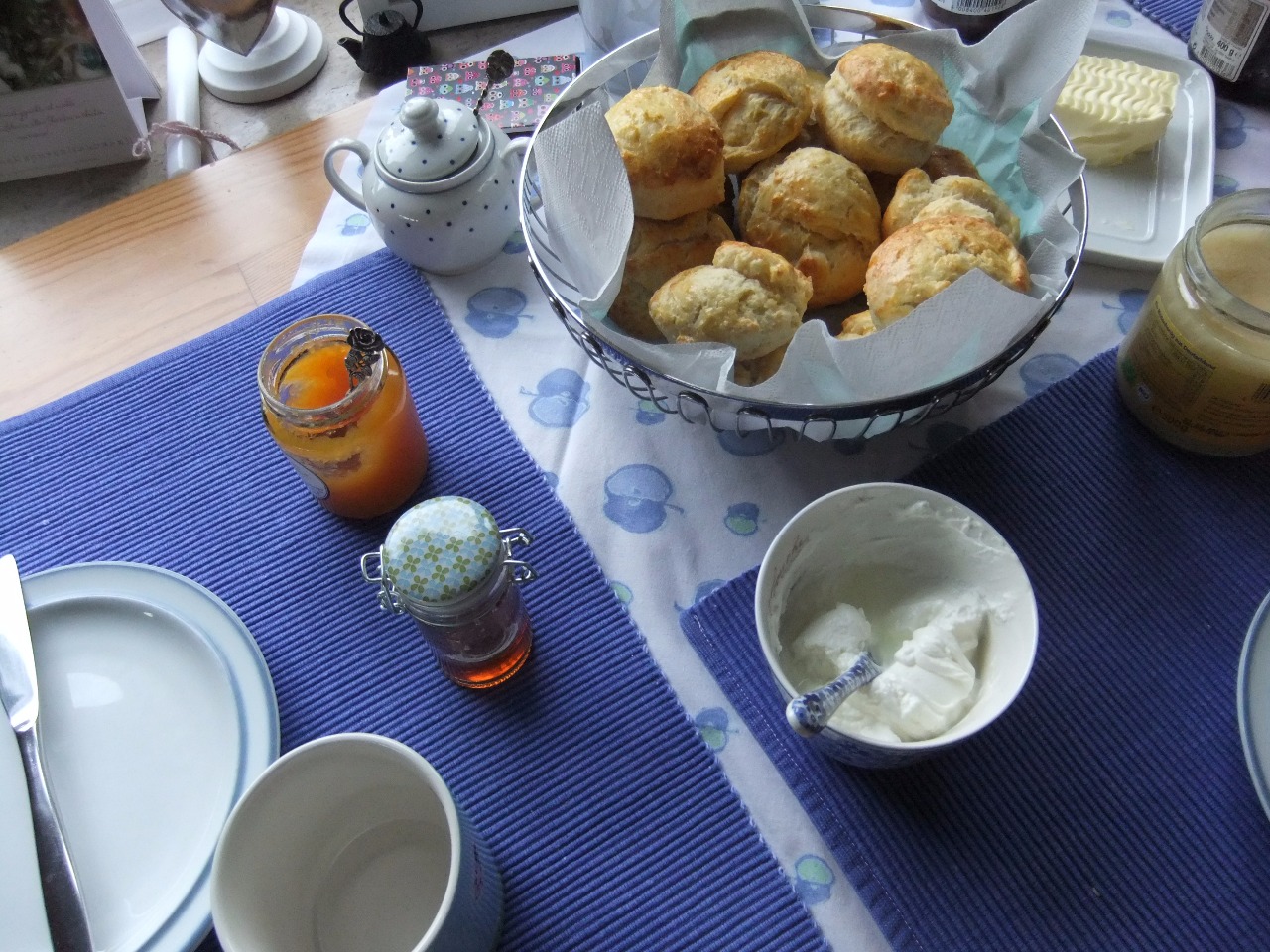 Natürlich schmecken die Scones frisch am besten. Sie lassen sich aber auch einfrieren und nochmal kurz aufbacken. Also frisch genießen, entweder zum Frühstück, wie wir am vergangenen Sonntagmorgen oder auch nachmittags, wie z.B. in England.