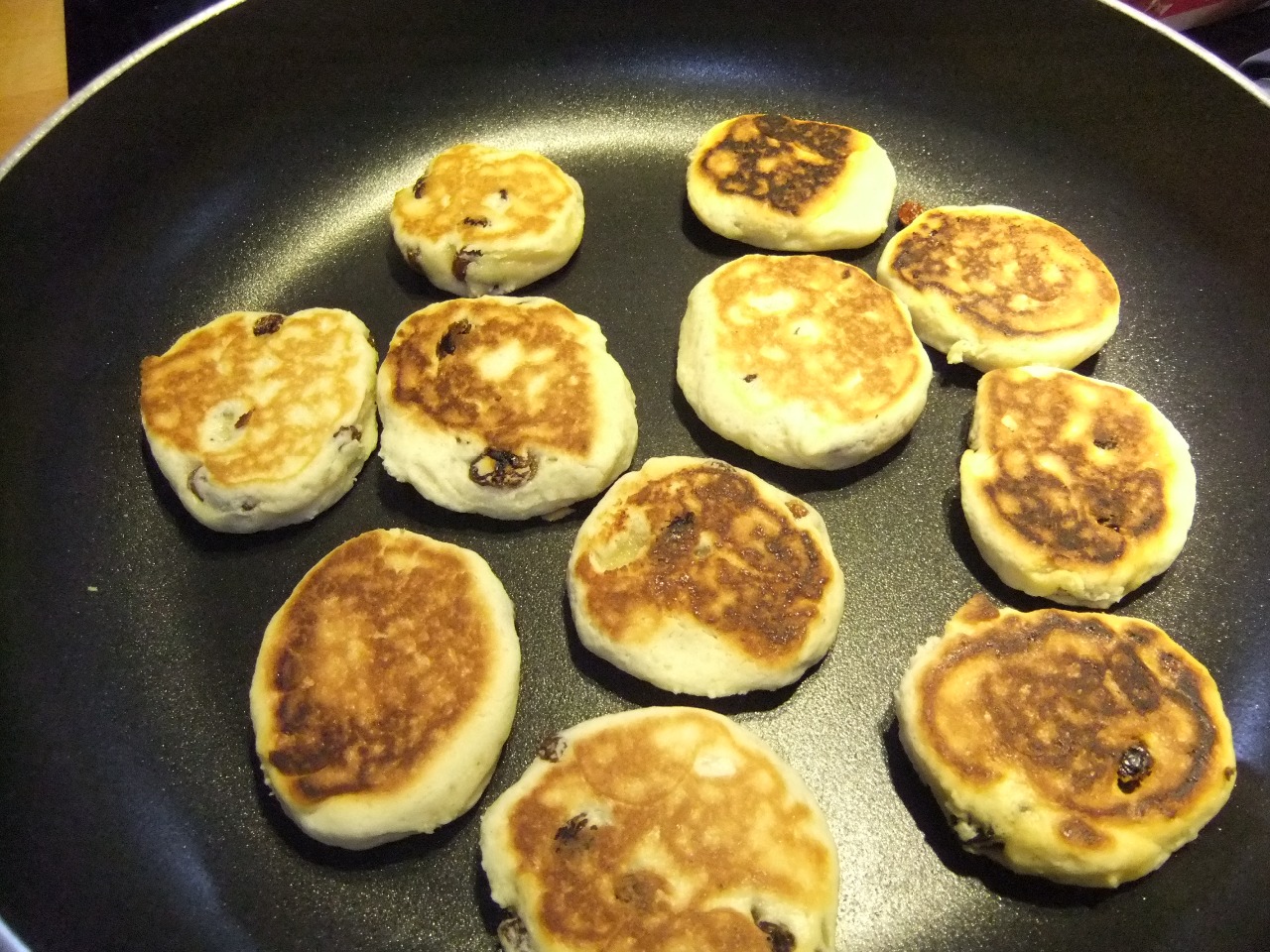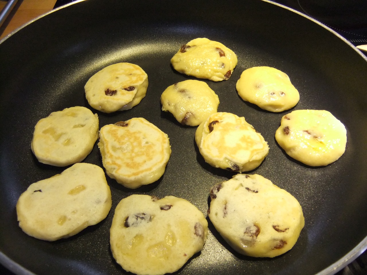 Aus 500 g Mehl , 200 g Butter (!!!) 175 g Zucker, 2 Eier, ein kräftiger Schuss Milch und 2 Handvoll Rosinen wird ein Teig geknetet, der weich und soft ist! Ich persönlich würze den Teig noch mit etwas Kardamom, Muskat und einer Prise Zimt (alles Geschmacksache)! Traditionell wird der Teig dann ausgerollt und Kreise ausgestochen! Da ich öfter während dem Kochen noch ein bißchen backe und mir das dann zu kompliziert ist, forme ich aus dem Teig Kugeln, die ich flach drücke und dann in der Pfanne "backe" ! Gestern habe ich nochmal gelesen, dass die Welsh cakes ohne Fett in einer beschichteten Pfanne gebacken werden, bisher hatte ich sie immer in Butter gebacken, was auch in einem Rezept stand. Ehrlich gesagt schmeckt das auch noch besser und die Miss A. hat es auch sofort gemerkt und bemängelt, aber ohne Fett geht es auch und es gibt weniger "Matscherei"! Die Hüften freut es außerdem auch. Aber das Problem hat die Miss A. ja nicht! :)